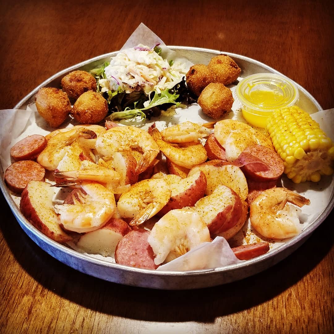 Peel and Eat shrimp, sausage, red potatoes. Served with slaw and corn