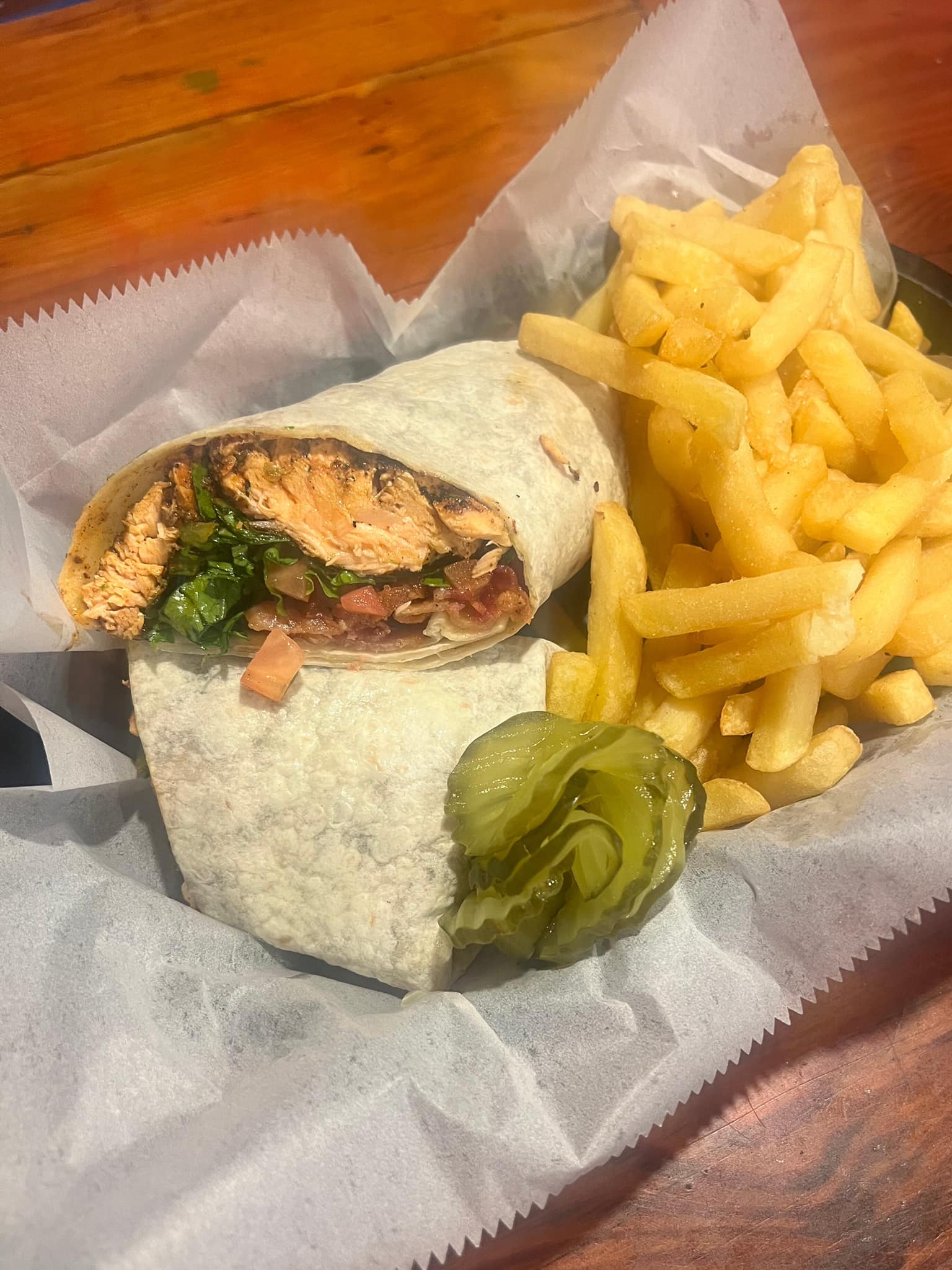 With lettuce, tomato, slaw and boom boom sauce. Served with Fries and pickles.